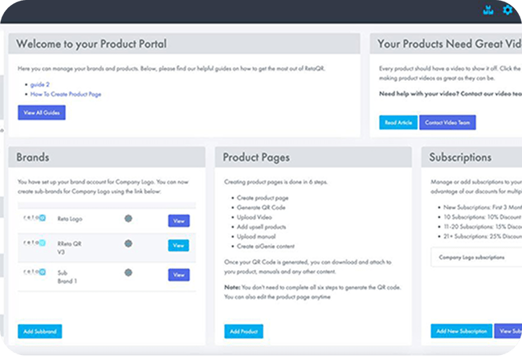 Host “how to” videos, e-Manuals, access to Intelligent agent AI supported Q&A, and contact customer support. Generate and manage QR